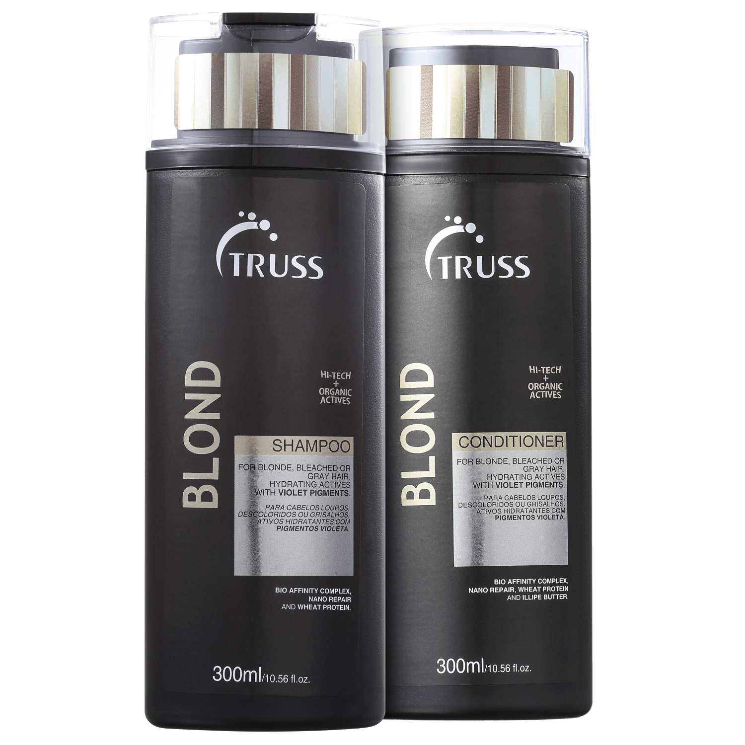 Kit shampoo e condicionador para cabelos loiros descoloridos ou com luzes. Truss Blond Duo combate o tom amarelado e fortalece os fios.